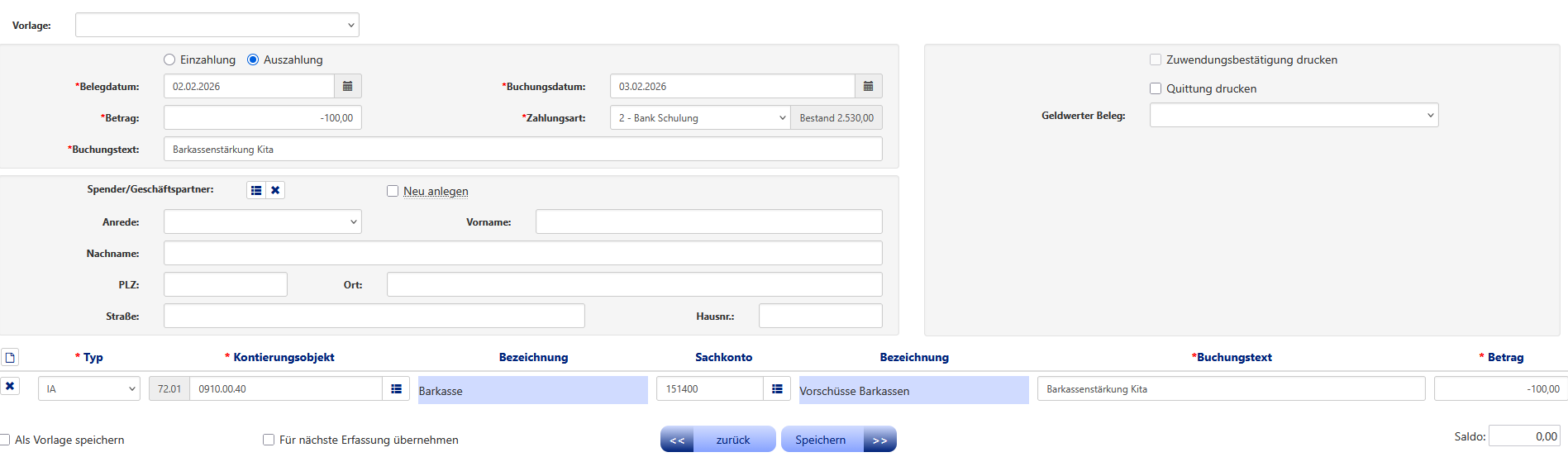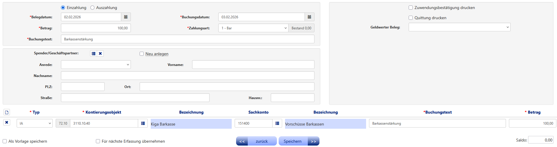 Sie klicken "Einzahlung" an und füllen die Felder "Belegdatum, Buchungsdatum, Betrag und Buchungstext" aus. Als Zahlart hinterlegen Sie die Zahlart "1 - Bar".