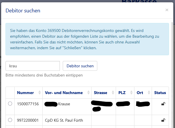 Wenn der gewünschte Name bzw. Geschäftspartner anzeigt wird, wählen Sie diesen an. Ansonsten verwenden Sie immer den "CpD" Ihrer Kirchengemeinde. Der Geschäftspartner CpD ist eine technische Sammelstelle für die Geschäftspartner, für die kein eigener Debitor oder Kreditor angelegt worden ist.