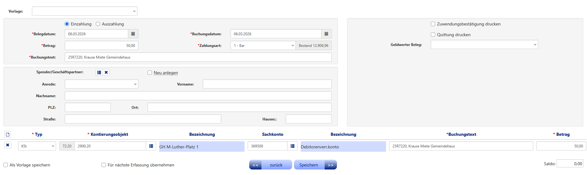 Sie klicken "Einzahlung" an und füllen die Felder "Belegdatum, Buchungsdatum, Betrag und Buchungstext" aus. Als Zahlart hinterlegen Sie "1 - Bar". Beim Buchungstext auch die Rechnungsnummer aus der Fakturierung eintragen. Im nächsten Schritt wählen Sie das entsprechende Kontierungsobjekt aus. Wichtig ist, dass Sie als Sachkonto "369500 Debitorenverrechnungskonto" anklicken.