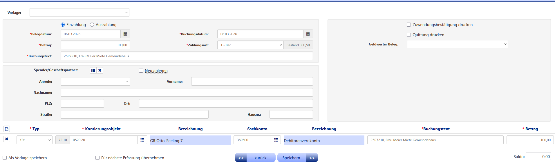 Sie klicken "Einzahlung" an und füllen die Felder "Belegdatum, Buchungsdatum, Betrag und Buchungstext" aus. Als Zahlart hinterlegen Sie "1 - Bar". Beim Buchungstext auch die Rechnungsnummer aus der Fakturierung eintragen. Im nächsten Schritt wählen Sie das entsprechende Kontierungsobjekt aus. Wichtig ist, dass Sie als Sachkonto "369500 Debitorenverrechnungskonto" anklicken.